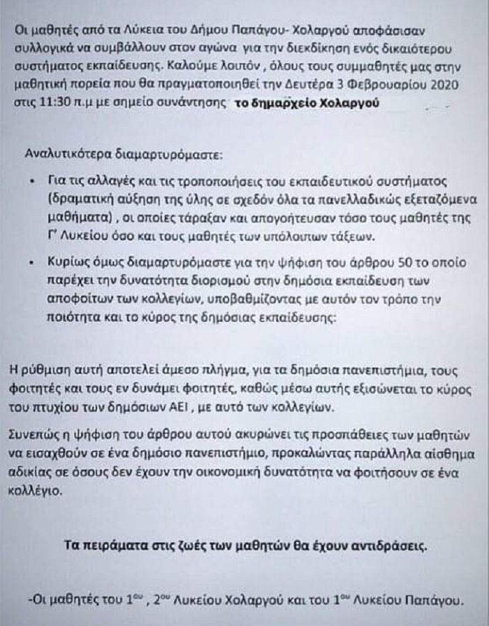 Διαβάστε το κείμενο για τη σημερινή διαμαρτυρία που συνυπογράφουν οι μαθητές και των τριών Λυκείων της πόλης: