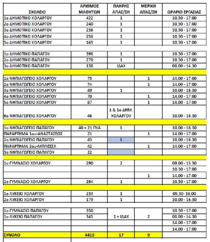 Στον πίνακα που ακολουθεί μπορεί κανείς να δει πως κατανέμονται οι καθαριστές στα σχολεία. Όσο για τα παραρτήματα των Νηπιαγωγείων του