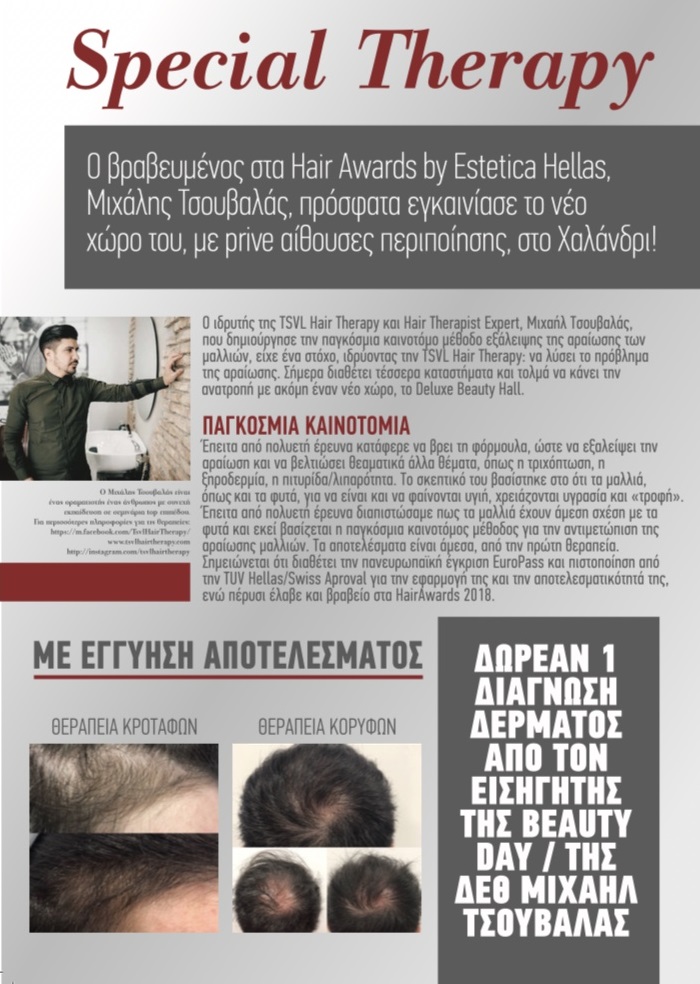 Στο Χαλάνδρι βρίσκεται ένας απ’ τους καλύτερους κομμωτές στην Ελλάδα, ο Μιχάλης Τσουβαλάς. Γεννημένος σε οικογένεια κομμωτών, ο Μιχάλης ήδη στα 30 του έχει βρει την λύση στην αραίωση των μαλλιών με την θεραπεία TSVL Hair Therapy, ενώ είναι ιδιοκτήτης ενός πολυχώρου ομορφιάς στο Χαλάνδρι και ενός Hair Salon στην Ελευσίνα. Είναι, μάλιστα, προσωπικός Hair Therapist και Stylist πολλών καλλιτεχνών και celebrities.