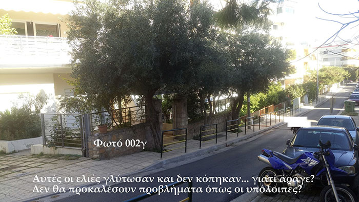 Με πρωτοφανή αφανισμό των δένδρων και του πρασίνου γενικότερα, υποστηρίζοντας πως οι ελιές κάνουν ζημιές ενώ κάποιες γλύτωσαν την κοπή και ποτέ δεν μου εξήγησαν το γιατί. Φωτό 002α - 002β – 002γ