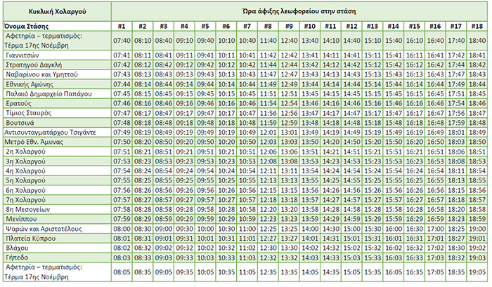 Αντίστοιχα, το δρομολόγιο της Κοινότητας Χολαργού που ξεκινά από την Πλατεία Εθνικής Αντιστάσεως (τέρμα 17ης Νοεμβρίου) στις 7:40 το πρωί, ανά μισή ώρα θα έχει ως τελευταίο δρομολόγιο στις 18.40 το απόγευμα.