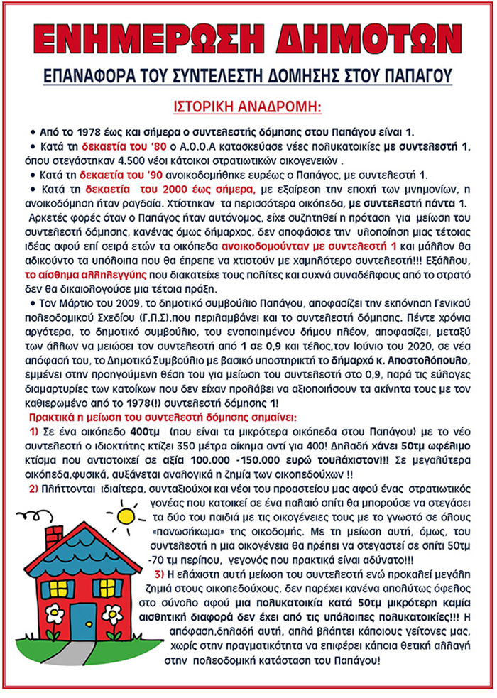 Με πρωτοβουλία του πρ. Αντιδημάρχου Παπάγου και πρ. Προέδρου του Δημοτικού Συμβουλίου Δημήτρη Οικονόμου και ομάδας Παπαγιωτών που τον πλαισιώνουν κορυφώνεται η συλλογή υπογραφών με καθαρό αίτημα αυτή τη φορά την αλλαγή της πρόσφατης απόφασης του Δημοτικού Συμβουλίου -με τη σύγκλιση του- για τη μείωση του συντελεστή δόμησης στην Κοινότητα και την επαναφορά του στο 1, όπως αυτό ισχύει από το 1978.