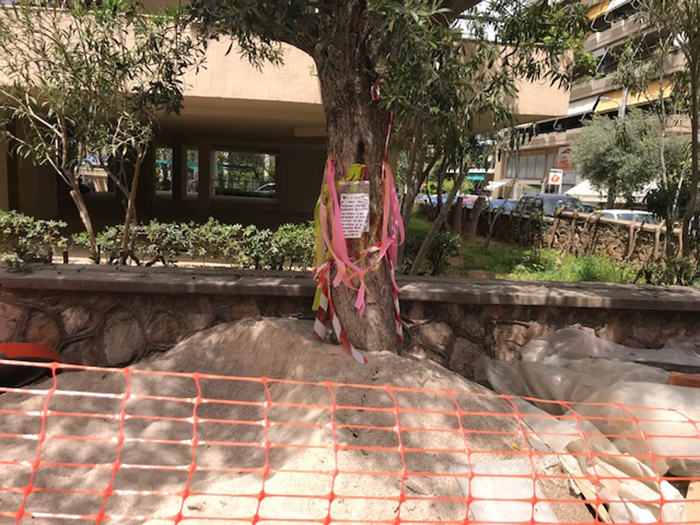Έτσι η αντίδραση έφερε... έμπνευση. Και εκτός από τις διαμαρτυρίες και τις καταγγελίες τόσο στις υπηρεσίες του Δήμου, όσο και στα social media, τώρα η αντίδραση πήρε χρώμα και κατέλαβετο πεζοδρόμιο. Με τα ελαιόδεντρα να γεμίζουν κορδέλες, χρώματα και μηνύματα σε μία κίνηση ευαισθητοποίησης από τους περίοικους, λίγο πριν αναλάβει ο εργολάβος να τα απομακρύνει.