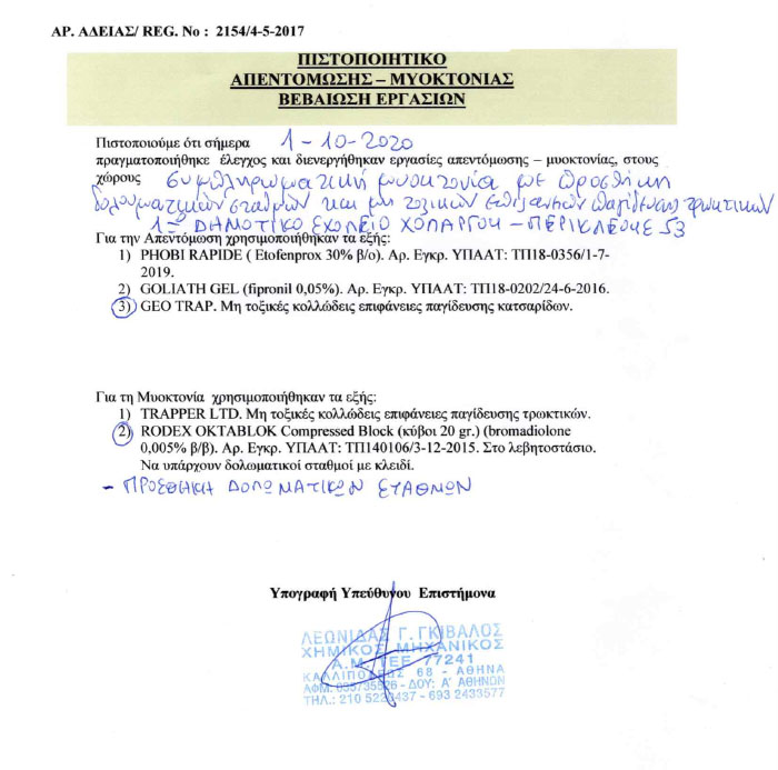 Ενδεικτικά σας αποστέλλουμε συνημμένα την ενημερωτική επιστολή της εταιρείας «Μυοκτονική» και βεβαιώσεις μυοκτονίας – απολύμανσης που έχουν πραγματοποιηθεί στο 1ο Δημοτικό Σχολείο Χολαργού κατά το σχολικό έτος 2020-2021 έως και σήμερα.
