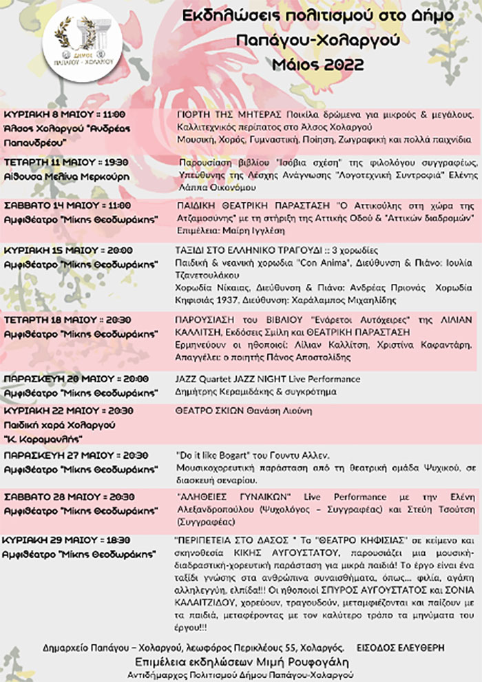 Μία σειρά πολιτιστικών εκδηλώσεων έχει προγραμματίσει ο Δήμος Παπάγου Χολαργού υπό την επιμέλεια της Αντιδημάρχου Πολιτισμού Μιμής Ρουφογάλη για το μήνα Μάιο. Πρώτη στη σειρά την Κυριακή 8 Μαίου μια μεγάλη ανοιξιάτικη γιορτή, ένας πολιτιστικός περίπατος μέσα στο Άλσος του Χολαργού με χορευτικά, μουσικά, εικαστικά, πολιτιστικά δρώμενα και πολλά παιχνίδια.