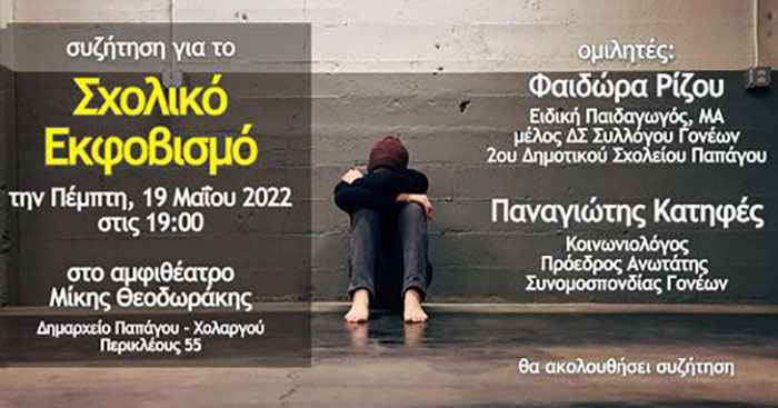 Η Ένωση Γονέων Παπάγου-Χολαργού προσκαλεί στη συζήτηση που διοργανώνει με θέμα τον σχολικό εκφοβισμό που θα πραγματοποιηθεί την Πέμπτη 19 Μαϊου 2022, στις 19:00, στο αμφιθέατρο «Μίκης Θεοδωράκης», στο Δημαρχείο Παπάγου-Χολαργού.