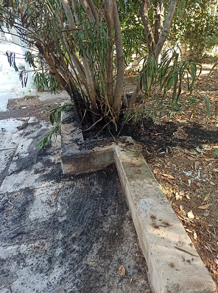 Η φωτιά στη Λεμεσού, η οποία προηγήθηκε κατέκαψε μόνο τη στοίβα με τα συγκεντρωμένα χορτάρια -ευτυχώς- και άφησε το στίγμα της στο πεζοδρόμιο.