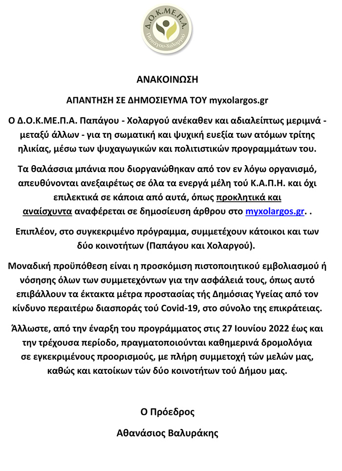 Αλγεινή εντύπωση προκάλεσε στη συντακτική ομάδα του myxolargos/mypapagos.gr η επίθεση που δέχτηκε μέσω ανάρτησης του ΔΟΚΜΕΠΑ και του Προέδρου του Θ. Βαλυράκη, η οποία καταγγέλλει το site μας, ότι δημοσίευσε «προκλητικό και αναίσχυντο» άρθρο, που αναφέρεται στα θερινά μπάνια για τα μέλη του ΚΑΠΗ.