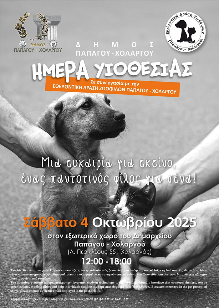 O Δήμος Παπάγου Χολαργού σε συνεργασία με την «Εθελοντική Δράση Ζωοφίλων Παπάγου Χολαργού» διοργανώνουν Ημέρα Υιοθεσίας το Σάββατο 4 Οκτωβρίου 2025.
