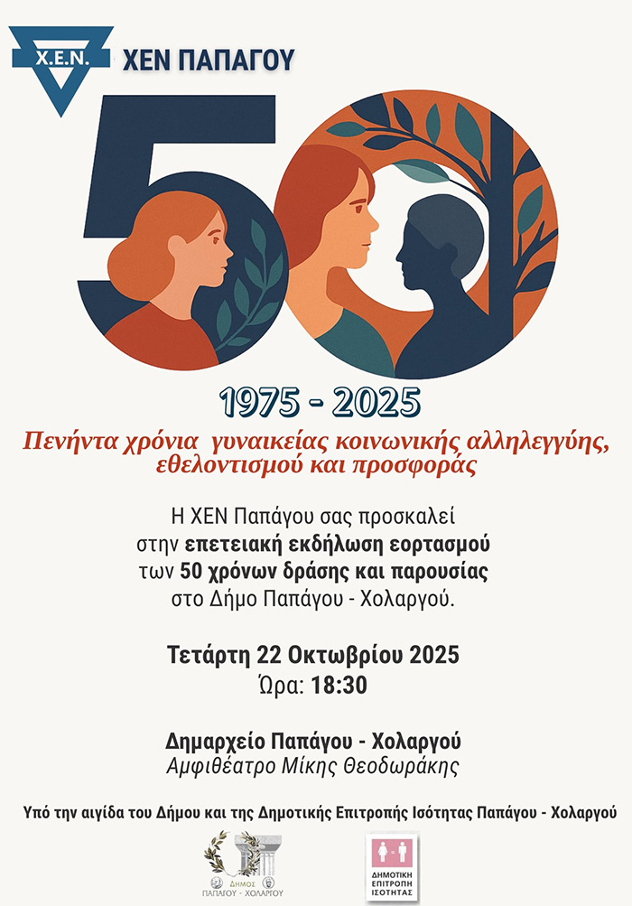 Η ΧΕΝ Παπάγου προσκαλεί όλους στην επετειακή εκδήλωση εορτασμού των 50 χρόνων δράσης και παρουσίας στο Δήμο Παπάγου -Χολαργού σε μία εκδήλωση παρουσίασης του πολυετούς έργου της, την Τετάρτη 22 Οκτωβρίου 2025 και ώρα 18.30μμ.