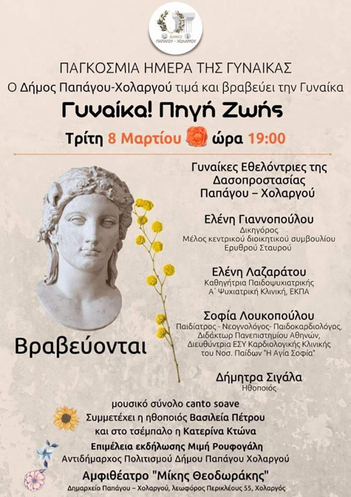Ο Δήμος Παπάγου – Χολαργού, όπως κάθε χρόνο έτσι και φέτος, με αφορμή την Παγκόσμια Ημέρα της Γυναίκας, τιμά γυναικείες προσωπικότητες που έχουν προσφέρει σε διαφορετικούς τομείς της κοινωνίας μας.