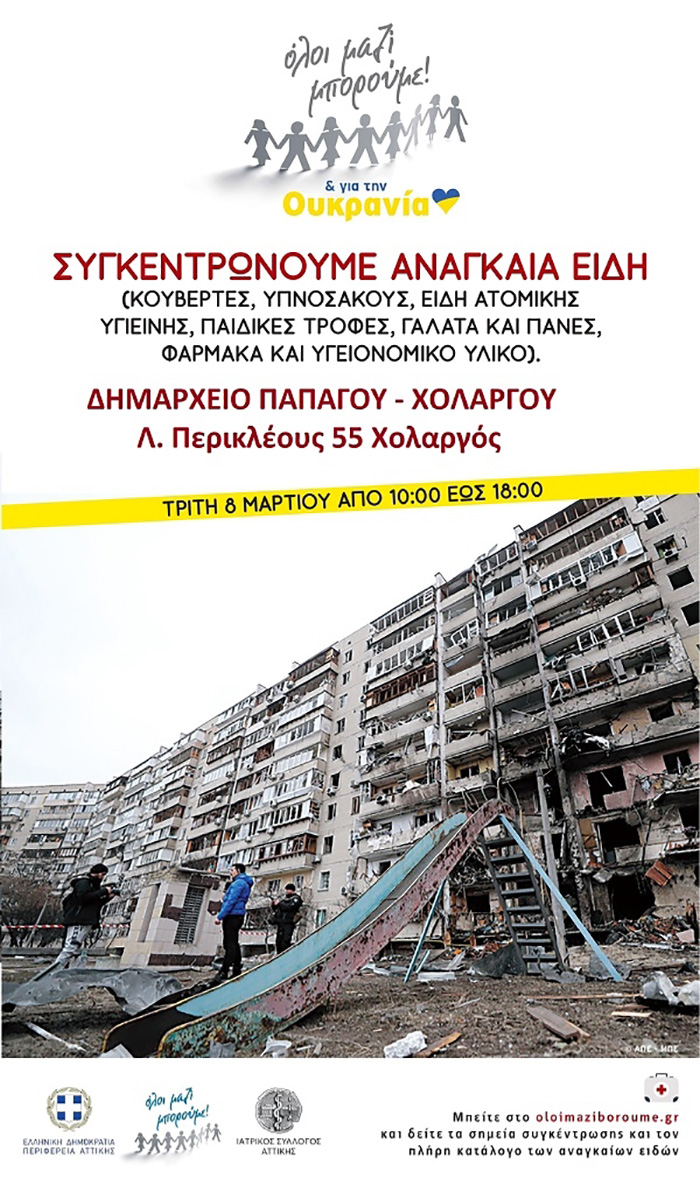 Οι τελευταίες εξελίξεις στην Ουκρανία δε μας αφήνουν ασυγκίνητους. Ο Δήμος Παπάγου – Χολαργού σε συνεργασία με το «Όλοι Μαζί Μπορούμε», την Περιφέρεια Αττικής και τον Ιατρικό Σύλλογο Αθηνών, διοργανώνουν δράση συγκέντρωσης ειδών για τους συνανθρώπους μας στην Ουκρανία.