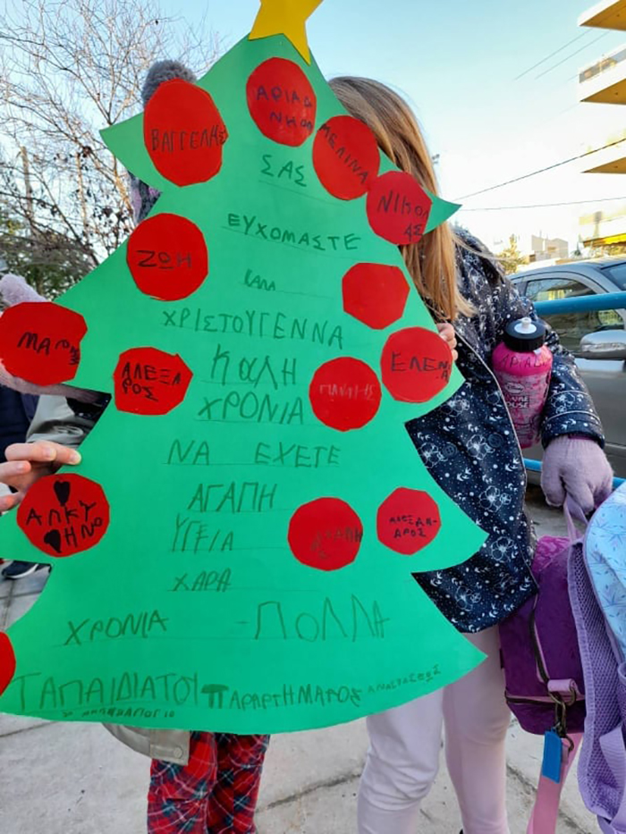 Με μία τεράστια κάρτα- έλατο, γεμάτη αγάπη και όμορφες ευχές οι λιλιπούτειοι μαθητές του 1ου Νηπιαγωγείου Παπάγου επισκέφθηκαν τον Ξενώνα Κακοποιημένων Γυναικών Χολαργού «Φοίβη»την Παρασκευή (17/12) το απόγευμα.