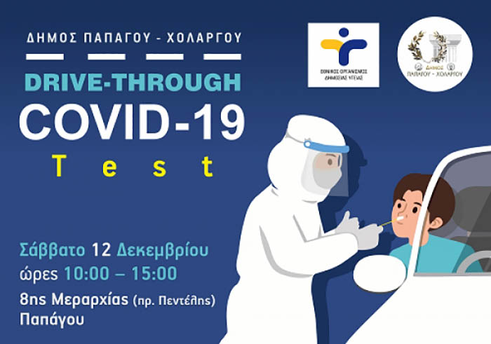 Ο Δήμος Παπάγου - Χολαργού σε συνεργασία με τον Εθνικό Οργανισμό Δημόσιας Υγείας, προχωρά στη διενέργεια drive through rapid tests, δωρεάν για τους κατοίκους της πόλης μας, το Σάββατο 12 Δεκεμβρίου 2020 και ώρες 10.00 έως 15.00, στην οδό 8ης Μεραρχίας Παπάγου (πρώην Πεντέλης).