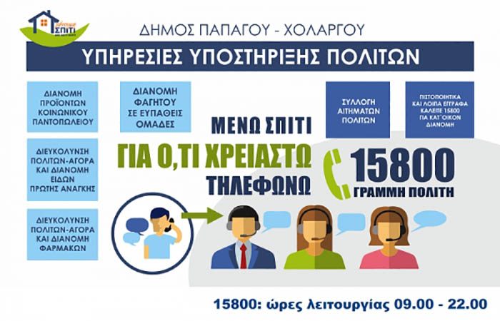 Ο Δήμος Παπάγου - Χολαργού με σκοπό την προάσπιση της υγείας των δημοτών και τον περιορισμό της διασποράς του κορονοϊού θέτει σε εφαρμογή τις έκτακτες υπηρεσίες υποστήριξης των πολίτων και συγκεκριμένα: