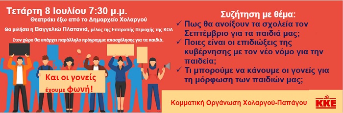 Την Τετάρτη 8 Ιουλίου, στις 19:30, στο Θεατράκι έξω από το Δημαρχείο Χολαργού θα πραγματοποιηθεί η εξ αναβολής εκδήλωση της Κομματικής Οργάνωσης Παπάγου-Χολαργού του ΚΚΕ με τίτλο ¨ΚΑΙ ΟΙ ΓΟΝΕΙΣ ΕΧΟΥΝ ΦΩΝΗ¨.