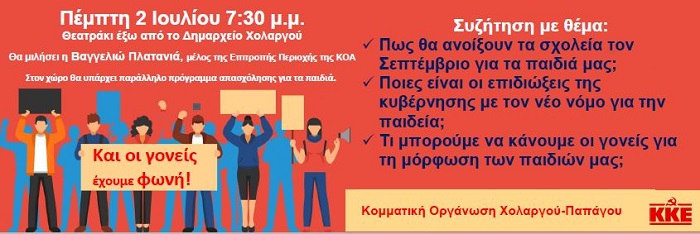 Για τα σχολεία διοργανώνει εκδήλωση η Κομματική Οργάνωση Χολαργού-Παπάγου του Κ.Κ.Ε. την Πέμπτη 2 Ιουλίου 2020, στο υπαίθριο θεατράκι του Δημαρχείου της Περικλέους, στις 7.30 μ.μ.