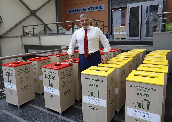Τοποθετήθηκαν σήμερα οι πρώτοι 36 ειδικοί κάδοι ανακύκλωσης και χωριστής συλλογής πλαστικών, μεταλλικών και χάρτινων συσκευασιών, στο πλαίσιο της εκστρατείας που έχει ξεκινήσει η Περιφέρεια για την προώθηση της ανακύκλωσης και την ενίσχυση του συστήματος διαλογής στην πηγή, στα κεντρικά κτίρια της Περιφέρειας Αττικής.
