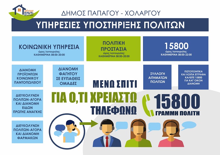 Τις 6 παροχές υπηρεσιών με κατ' οίκον παράδοση προς τους δημότες που έχουν ανάγκη μετά από κλήση στον πενταψήφιο 15800 ανακοίνωσε το βράδυ της Κυριακής (22/3) ο Δήμος Παπάγου Χολαργού. Παροχές που προβλέπονται και μετά τις έκτακτες εγκυκλίους του Υπουργείου Εσωτερικών.