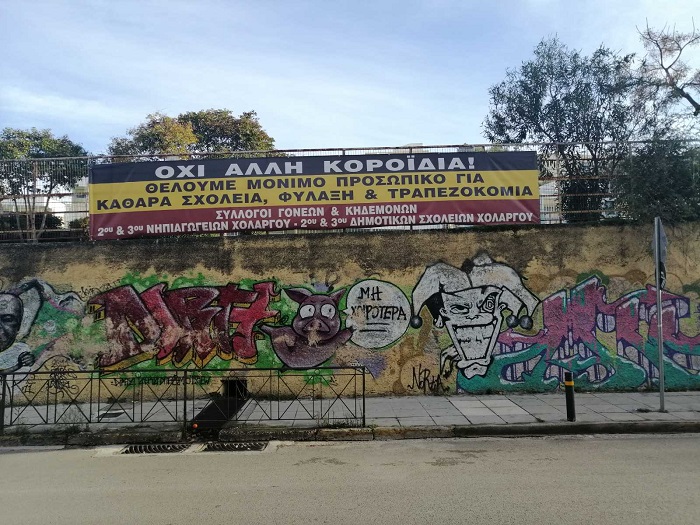 Με εντολή Βασίλη Σιαμάνη Αντιδημάρχου Καθαριότητας Χολαργού και την παρουσία του ίδιου κατέβηκε το πανό διαμαρτυρίας που αναρτήθηκε το βράδυ της Τρίτης στο σχολικό συγκρότημα της 17ης Νοεμβρίου. Ο λόγος της άμεσης καθαίρεσης σύμφωνα με τον Αντιδήμαρχο; Απαγορεύεται η ανάρτηση πανό από τον Κανονισμό Καθαριότητας του Δήμου! Ο Σύλλογος