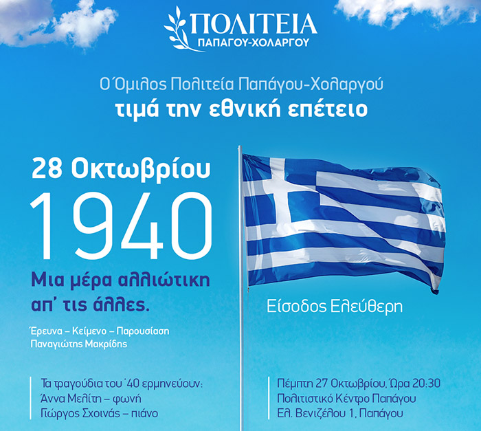 Ο Όμιλος «Πολιτεία Παπάγου-Χολαργού» τιμά την επέτειο του ΟΧΙ με εκδήλωση που διοργανώνει την Πέμπτη 27 Οκτωβρίου και ώρα 20.30μ.μ, στο Πολιτιστικό Κέντρο Παπάγου, οδός Ελ. Βενιζέλου 1, Παπάγου με ομιλητή το δημοσιογράφο κ. Παναγιώτη Μακρίδη.