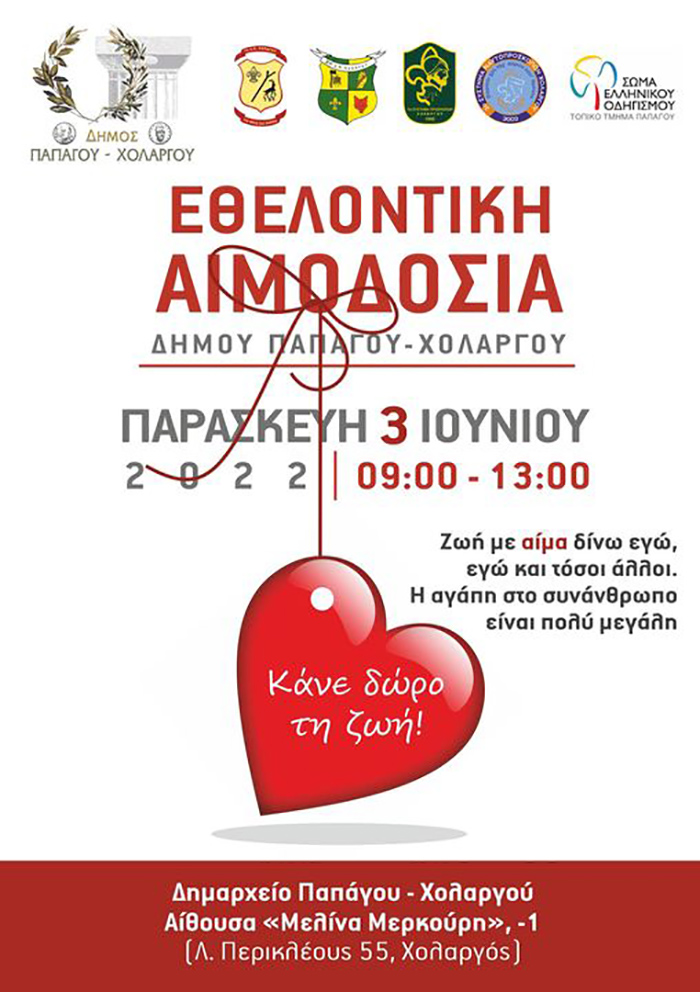Ο Δήμος Παπάγου - Χολαργού σε συνεργασία με τα: 1ο Σύστημα Προσκόπων Παπάγου, 2ο Σύστημα Προσκόπων Παπάγου, 1ο Σύστημα Προσκόπων Χολαργού, 2ο Σύστημα Ναυτοπροσκόπων Χολαργού, ΣΕΠ Τοπικό Τμήμα Παπάγου διοργανώνει εθελοντική αιμοδοσία την Παρασκευή 3 Ιουνίου 2022, στην αίθουσα «Μ. Μερκούρη» του Δημαρχείου (Λ. Περικλέους 55 Χολαργός).